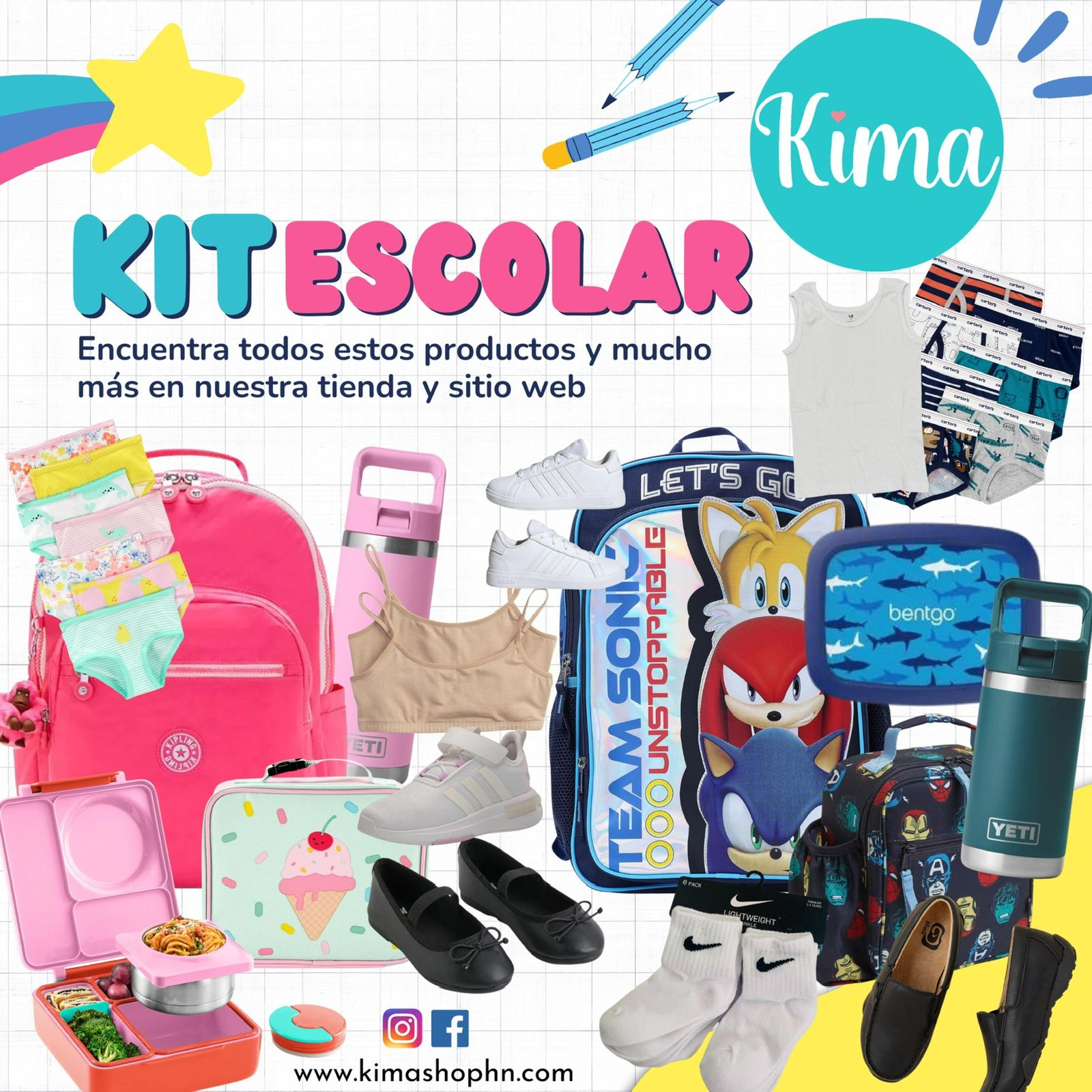 En KIMA, estamos felices de proveer durante 9 años la mejor calidad en ropa y zapatos al mejor precio, desde 0 meses hasta 18 años, con opciones exclusivas y también de bajo costo para todos los presupuestos, contamos con más de 60,000 skus listos para ser elegidos por ti y enviados hasta la puerta de tu casa en toda Honduras con un sólo click💫
