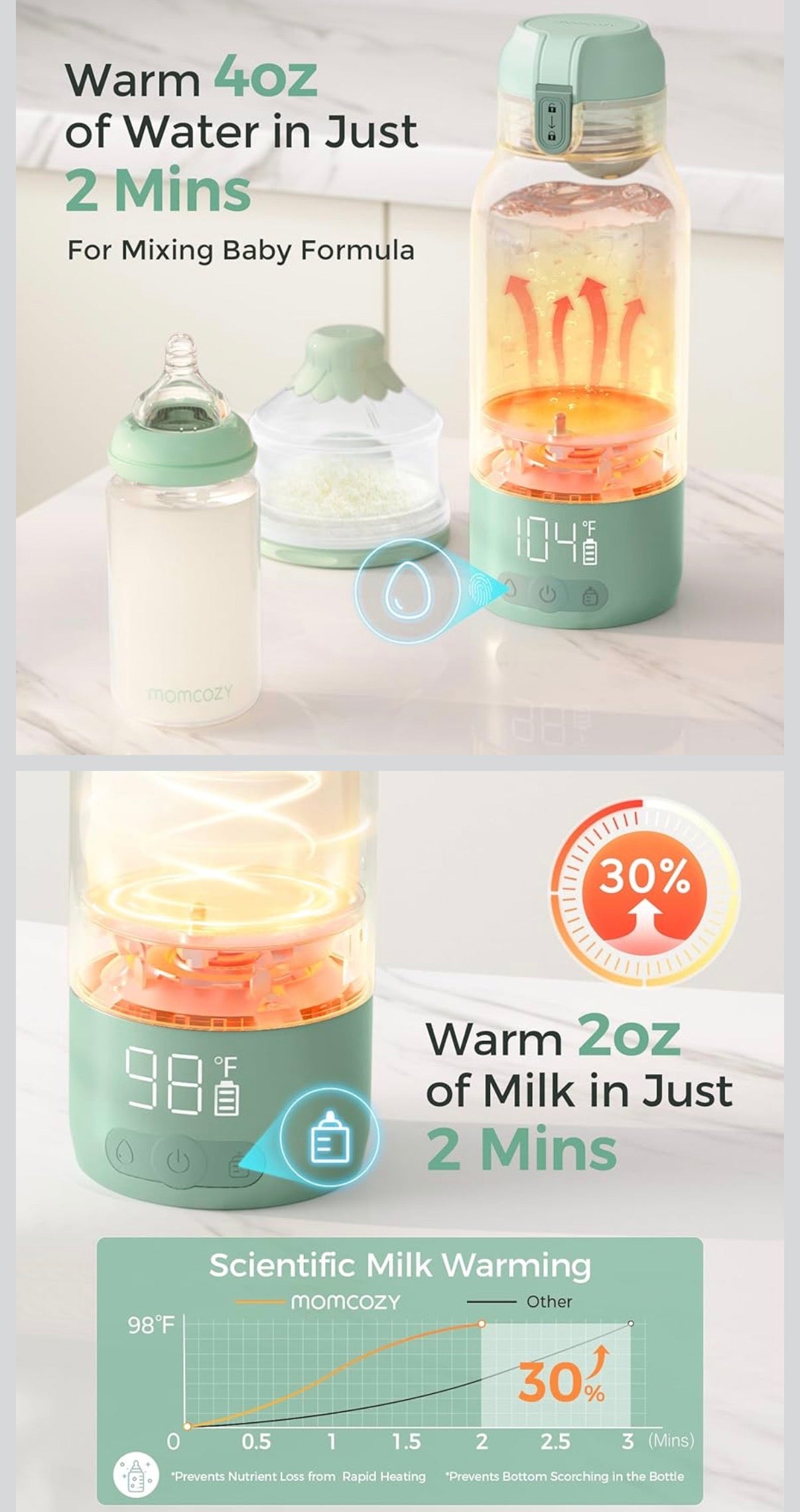 Calentamiento rápido con nutrientes preservados: caliente 4 onzas de agua a 104 °F en solo 2 minutos o leche materna a 98 °F en 5 minutos. La leche de tu bebé estará lista antes de que empiecen las lágrimas. Además, su sistema de calentamiento uniforme podría ayudar a conservar la mayoría de los nutrientes de la leche materna.