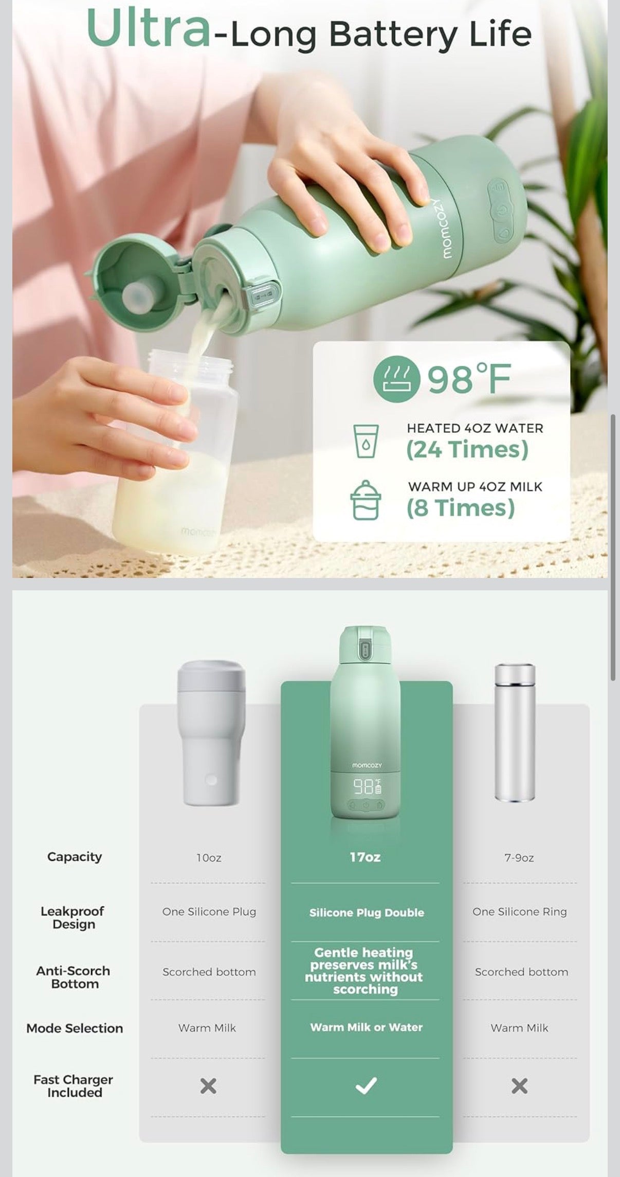 Batería recargable de larga duración: con una sola carga, puede calentar 4 onzas de agua hasta 24 veces o leche hasta 8 veces. Con una carga rápida de 1,5 horas, este diseño inalámbrico mantiene su calentador de biberones listo cuando y donde lo necesite, sin necesidad de enchufes.
