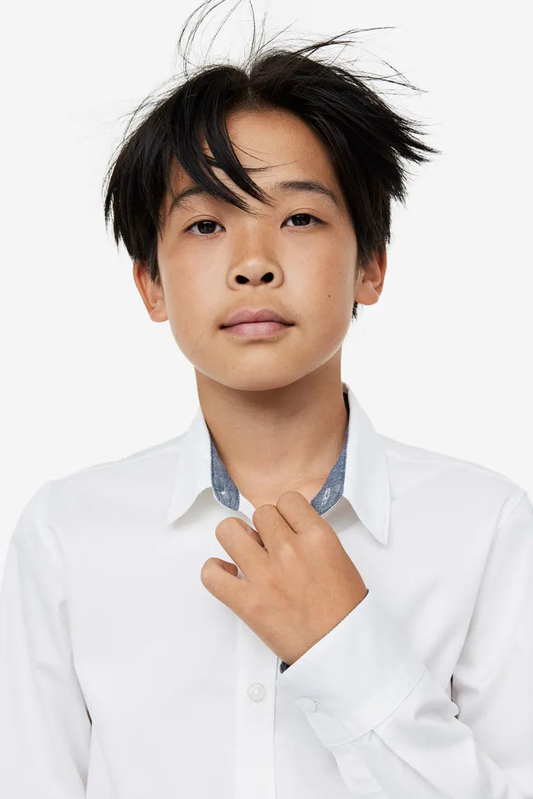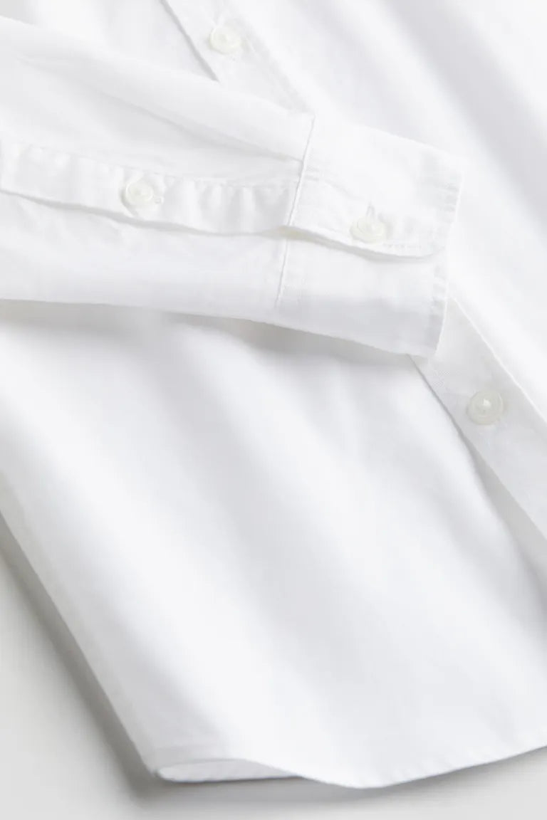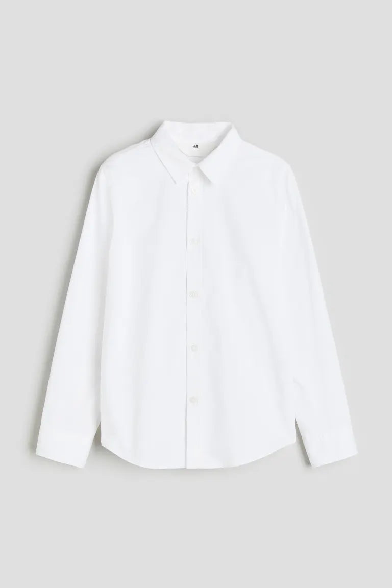 Long-sleeved shirt in woven cotton fabric with a small embroidered detail on chest. Turn-down collar, buttons at front and at cuffs, and contrasting color inside collar stand and cuffs.