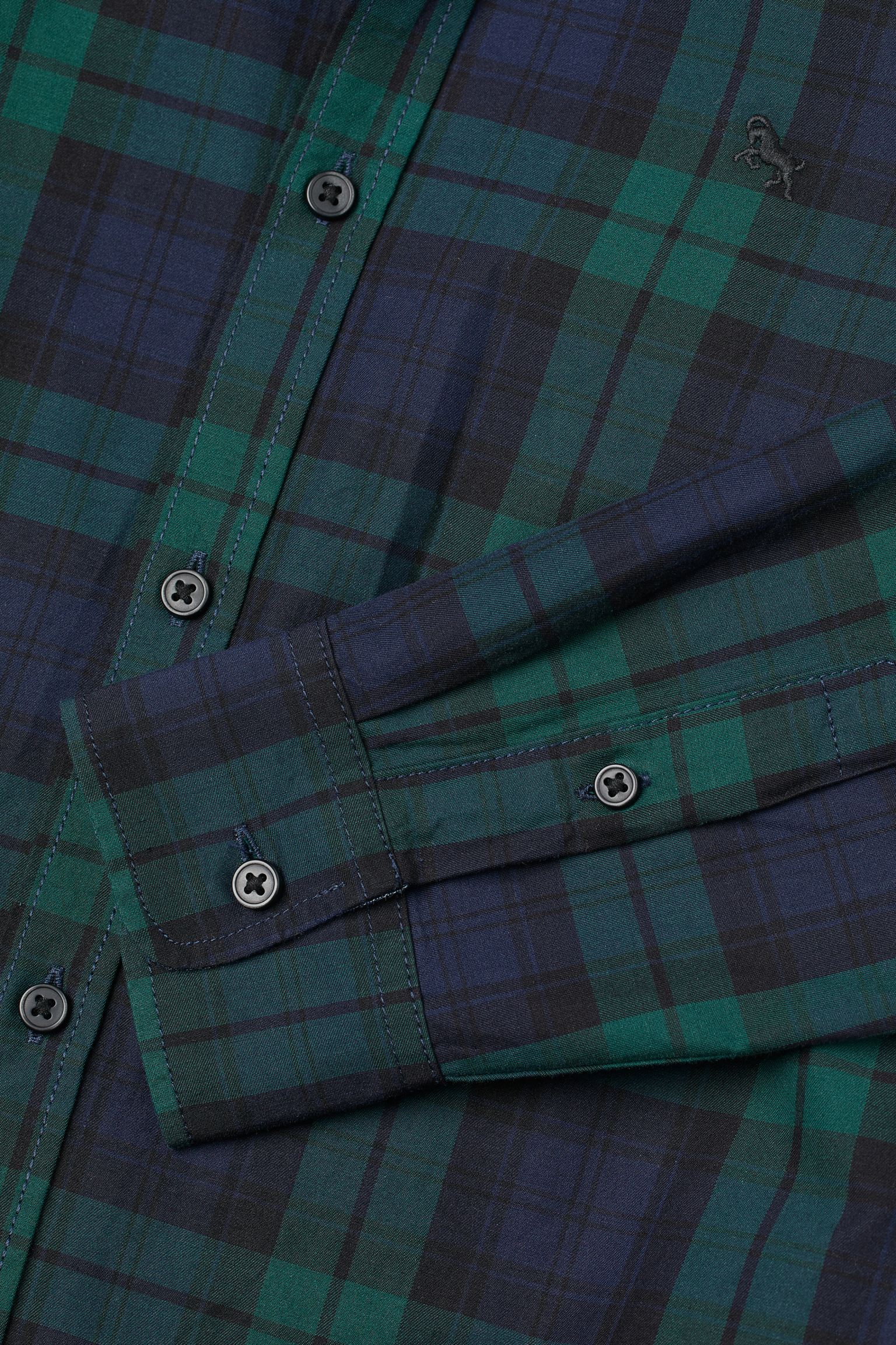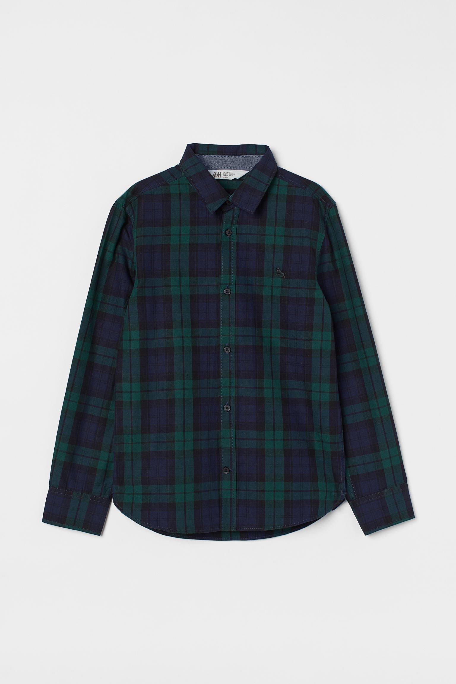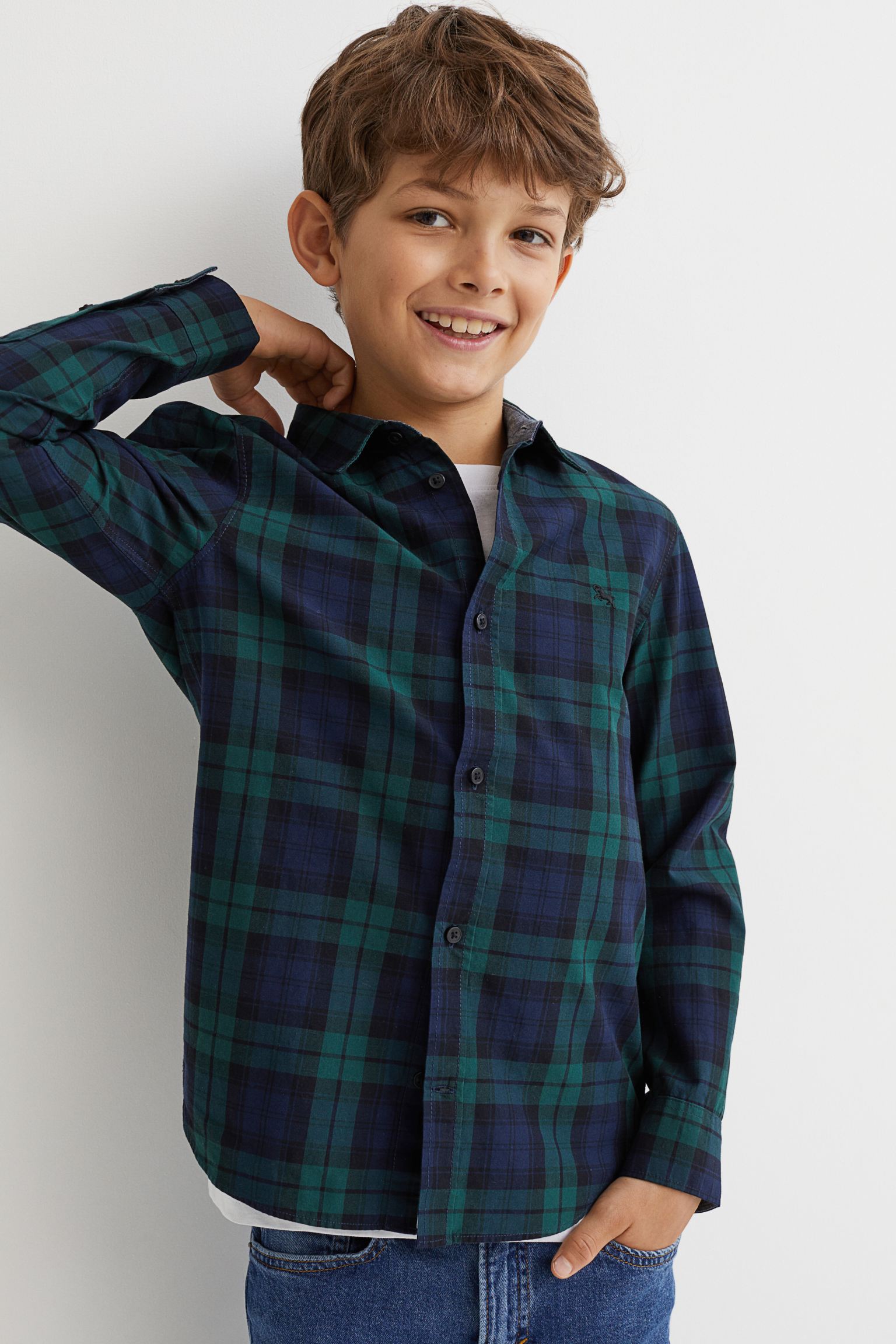 Long-sleeved shirt in woven cotton fabric with a small embroidered detail on chest. Turn-down collar, buttons at front and at cuffs, and contrasting color inside collar stand and cuffs.