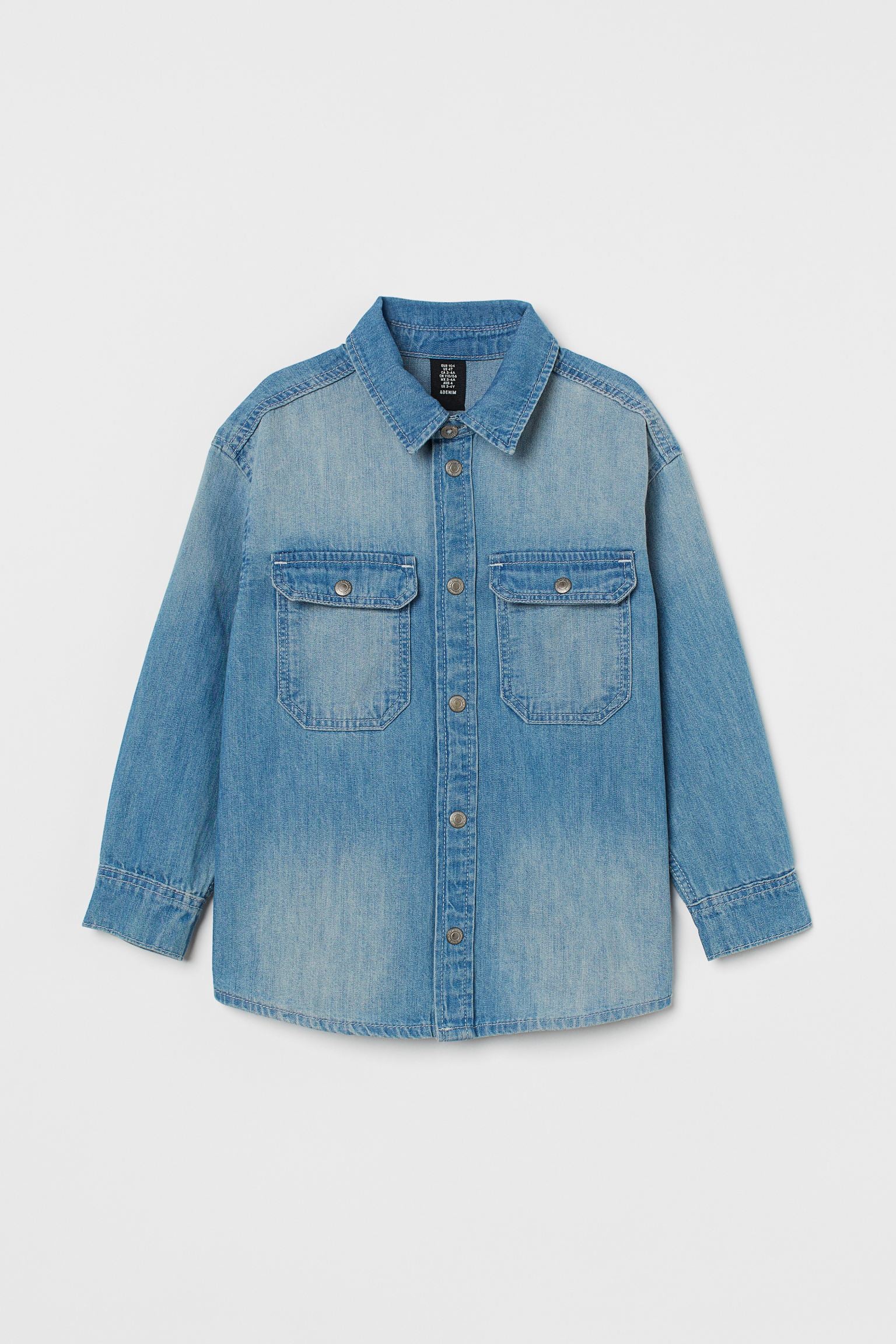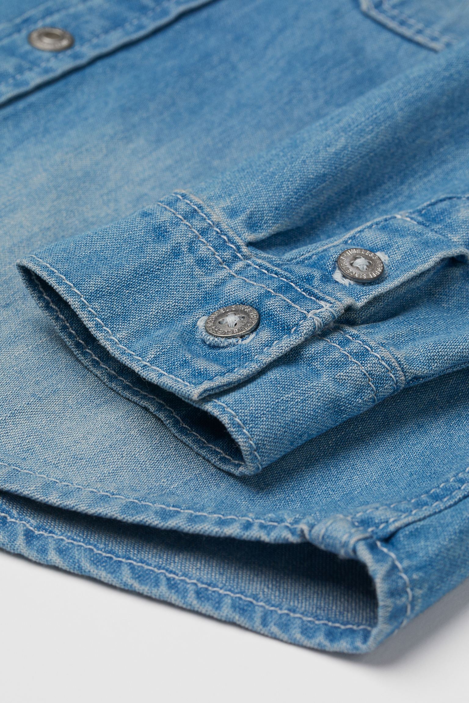 Shirt in thick, washed cotton denim. Collar, snap fasteners at front, and yoke at back. Chest pockets with flap and snap fastener, long sleeves with buttons at cuffs, and a rounded hem.