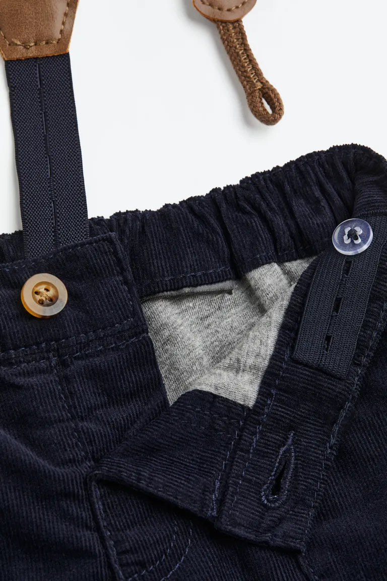 Set with a shirt and lined pants in woven cotton fabric with matching suspenders. Shirt with a button-down collar, yoke at back, buttons at front, long sleeves with button at cuffs, and a rounded hem. Pants with an adjustable, elasticized waistband, mock fly with button, patch front pockets, mock back pocket, and lining in soft jersey. Detachable elastic suspenders with faux leather details.