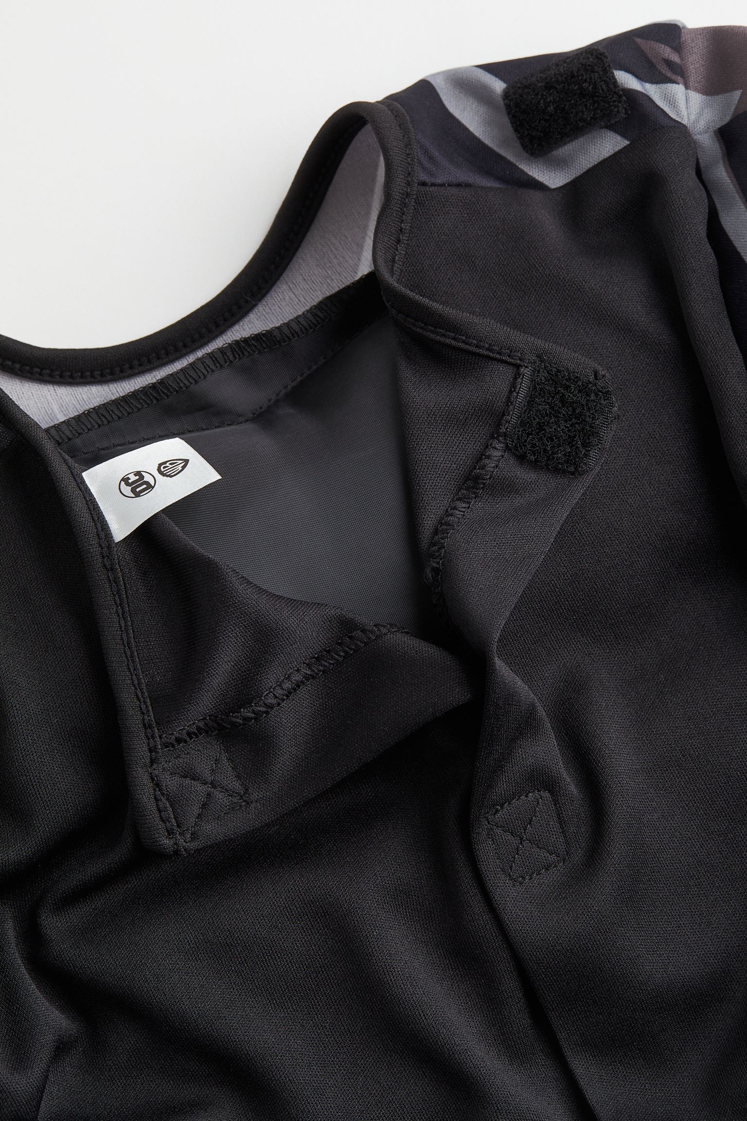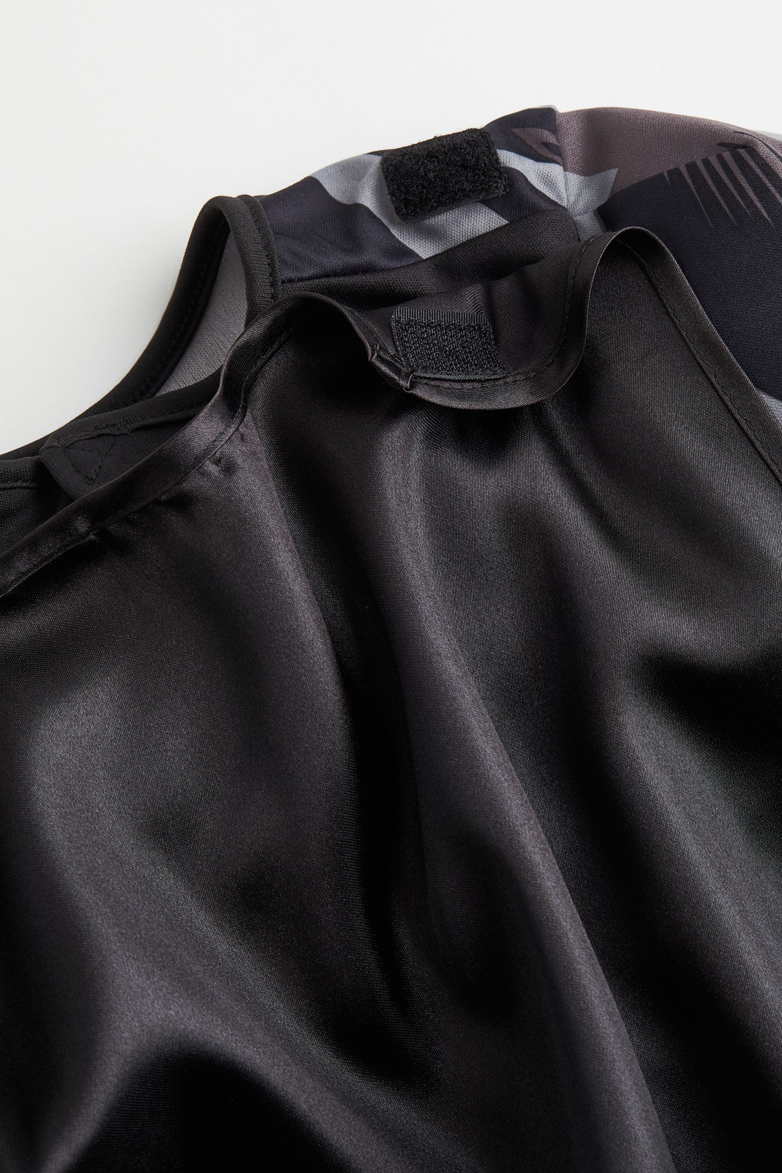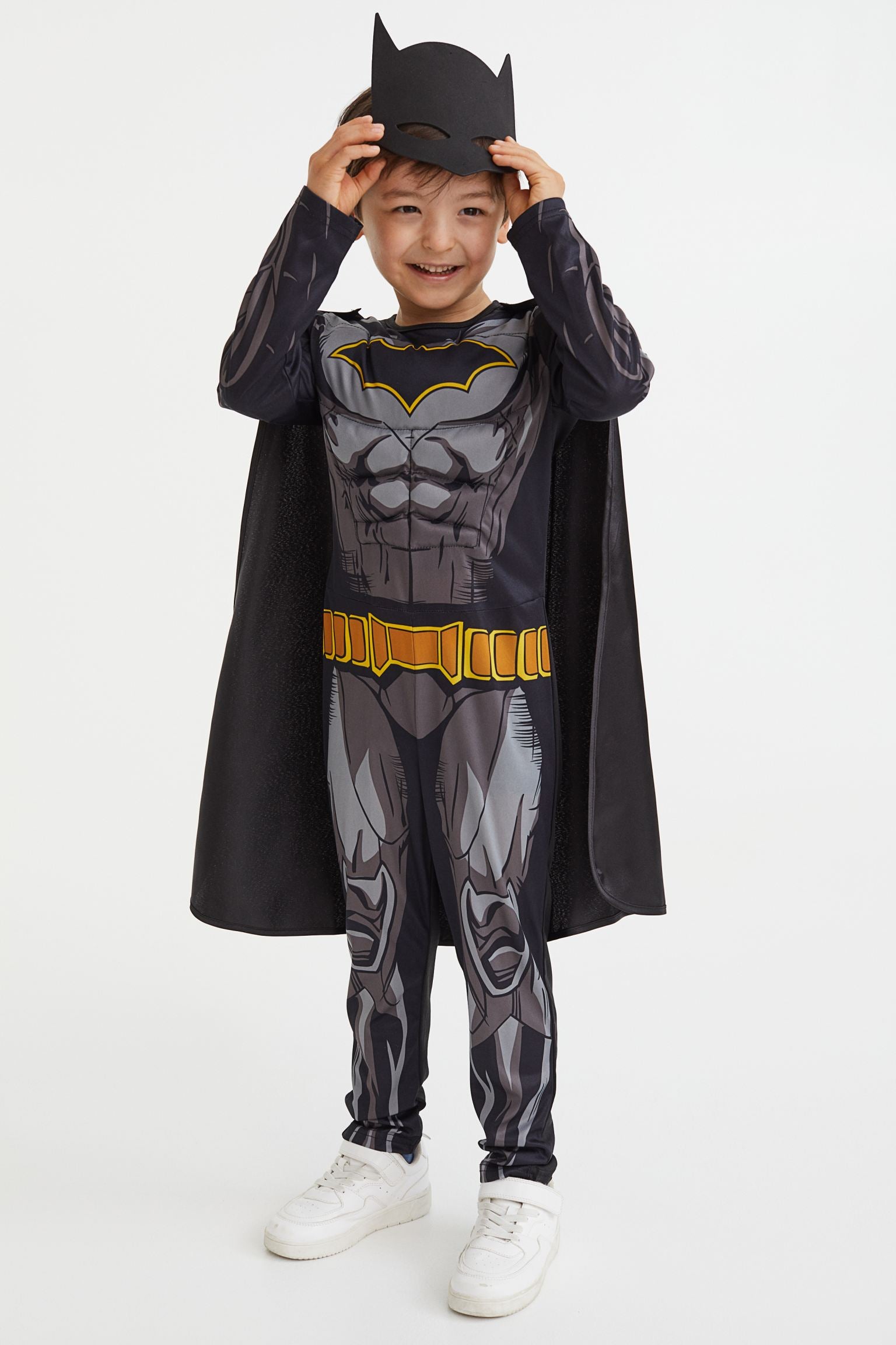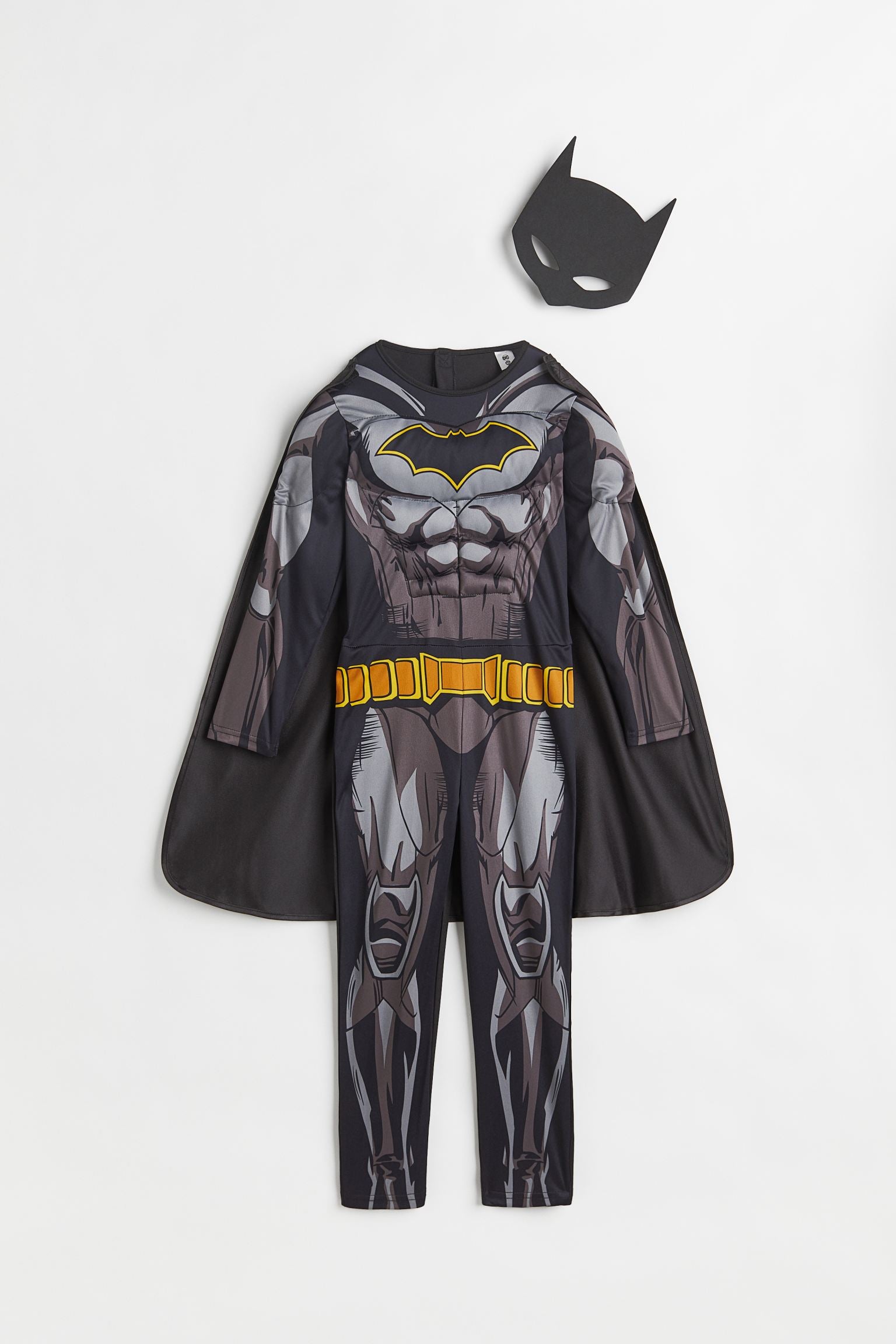 Costume in jersey with a printed design and appliqués. Opening at back with hook-loop fastening and removable cape with hook-loop fastening. Mask in plastic foam perfects the superhero look. Made to be used and loved for a long time – take care of it, pass it on, repair, and recycle.
