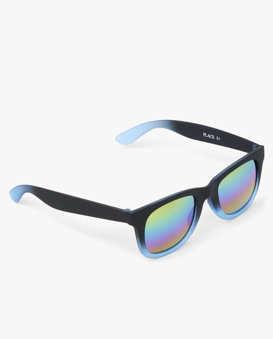 Sunglasses in plastic with tinted, UV-protective lenses.