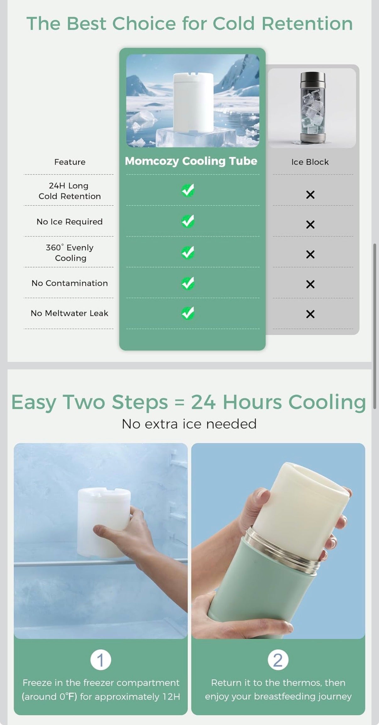 24H+ Enfriamiento extendido al aire libre: El enfriador de leche materna Momcozy adopta la tecnología de tubo de enfriamiento envolvente de 360° y mantiene las temperaturas consistentemente frías durante más de 24 horas, preservando la frescura de su leche materna y evitando la pérdida de nutrientes durante las actividades al aire libre.