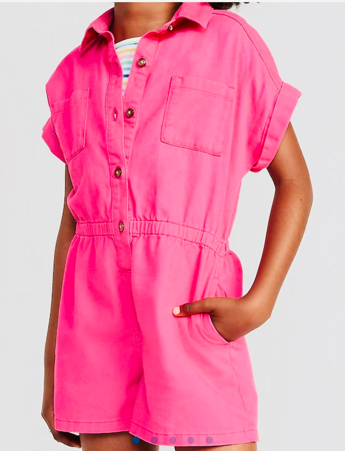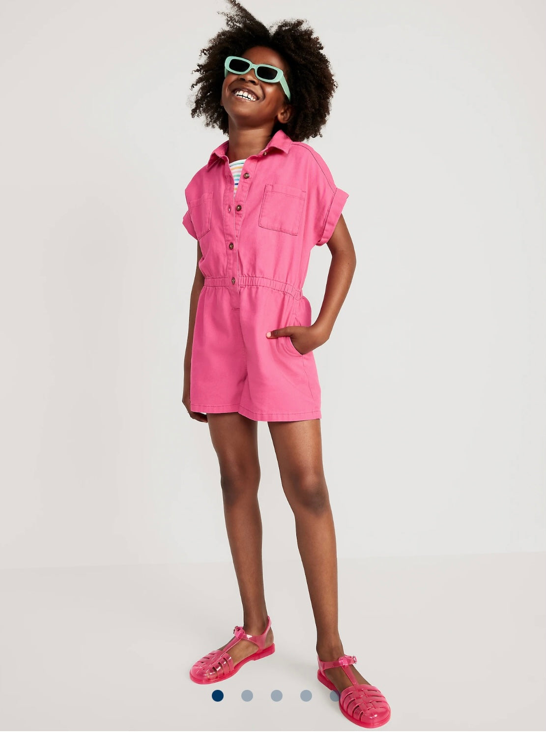 - Toddler girl one-piece has relaxed fit through body, with a cinched waist.