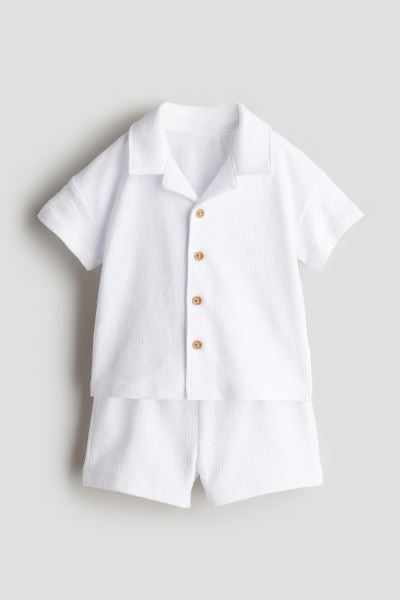 set with a T-shirt and shorts in soft fabric with a printed motif. T-shirt in cotton jersey with ribbing at neck, dropped shoulders, and wide sleeves. Lightweight sweatshorts with a drawstring and covered elastic at waistband.