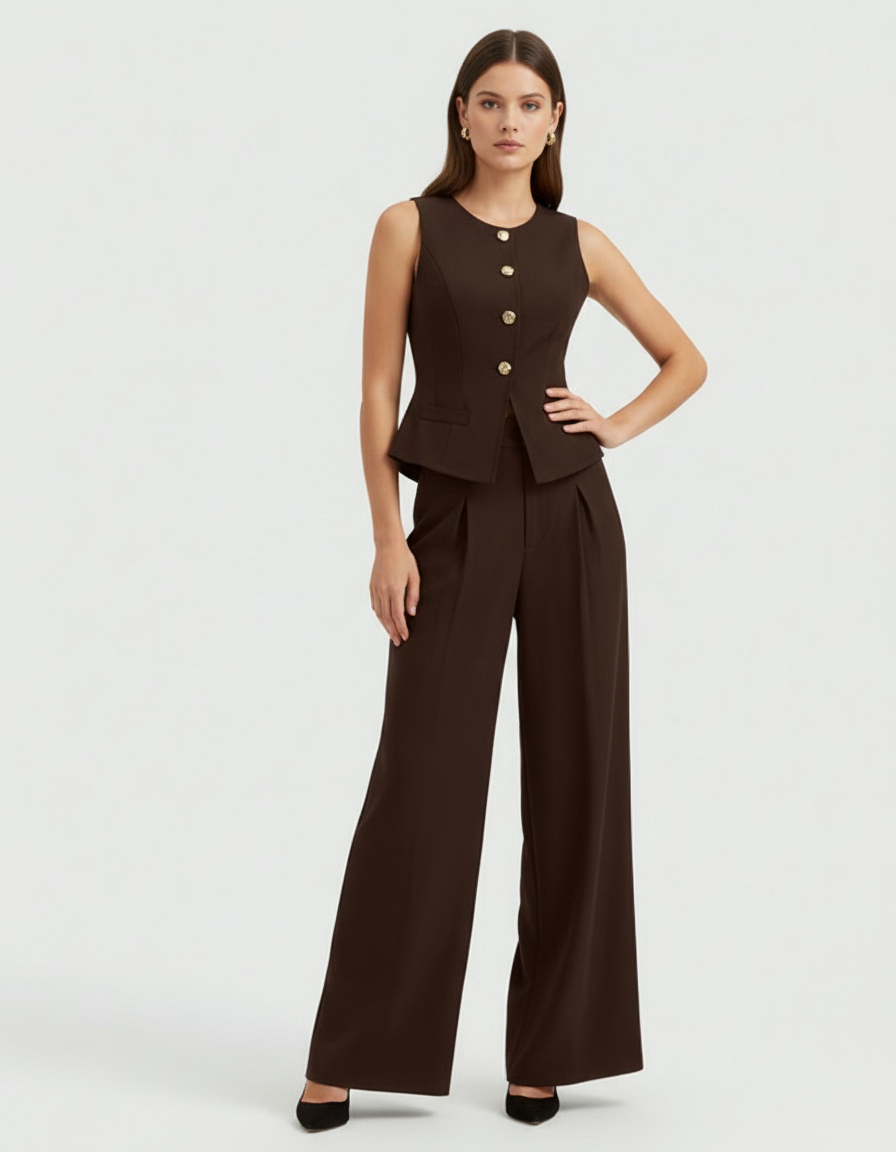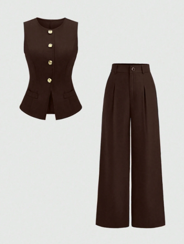 Set formal 2 piezas camisa chaleco blazer pantalon café sz25090354542415734