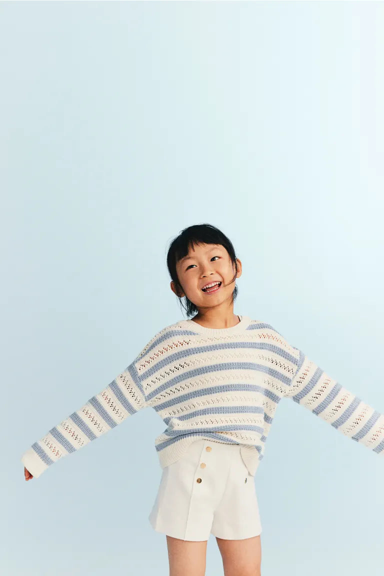 Relaxed-fit shorts in thick jersey with stitched creases on legs. Covered elastic at waistband for comfort and decorative metal buttons at front.