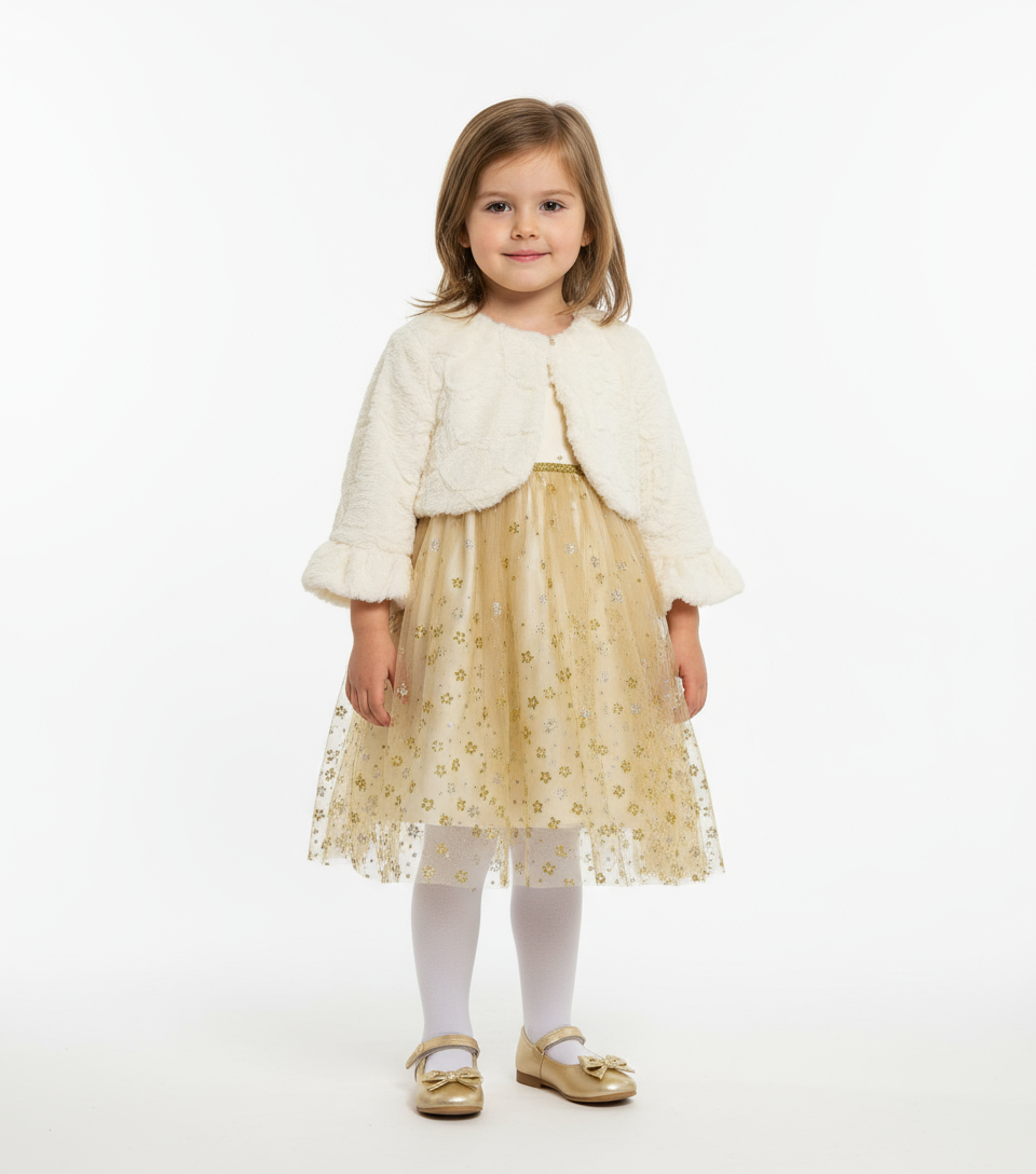 Vestido gala beige y dorado bluberri con chaleco sueter