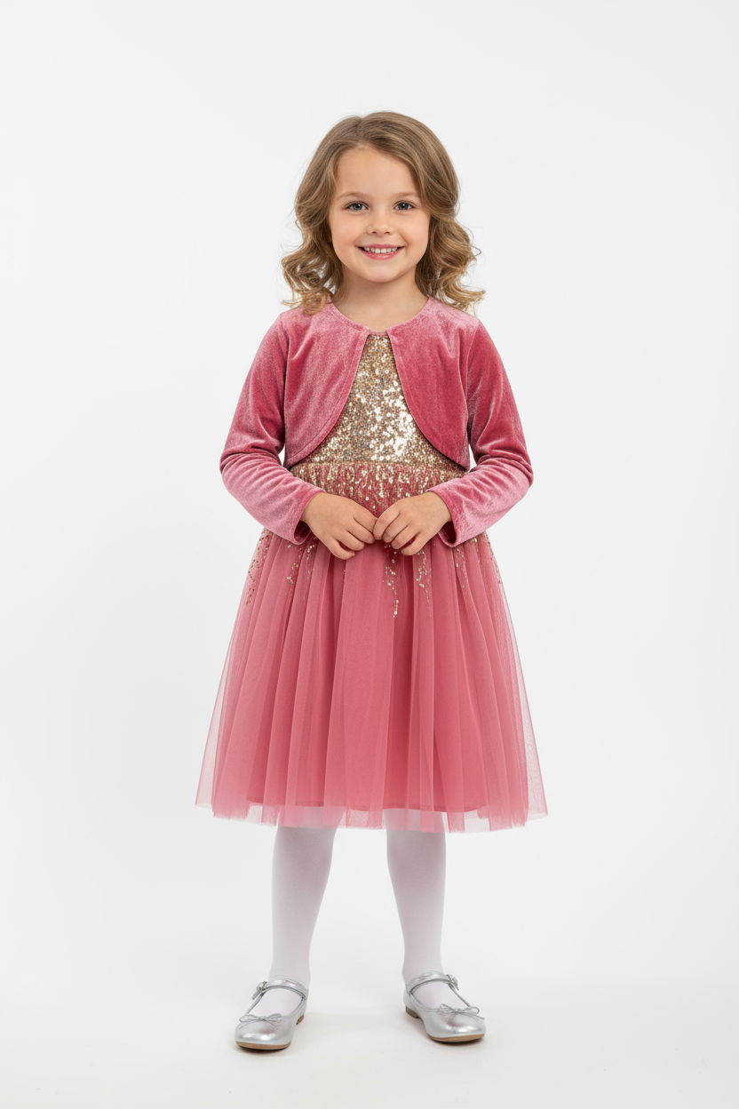 Vestido gala eventos rosado c/ chaleco lentejuela