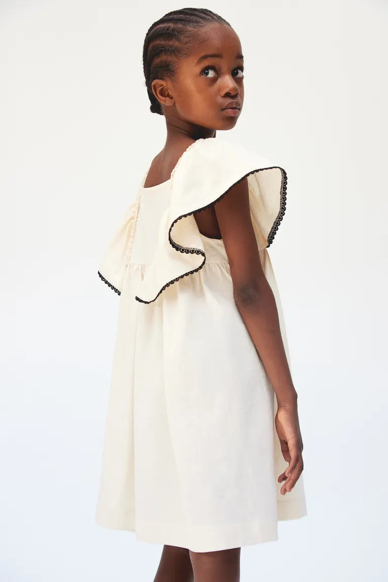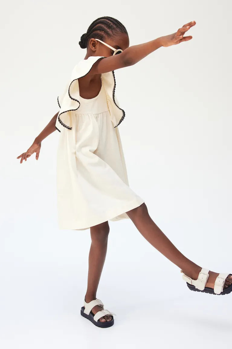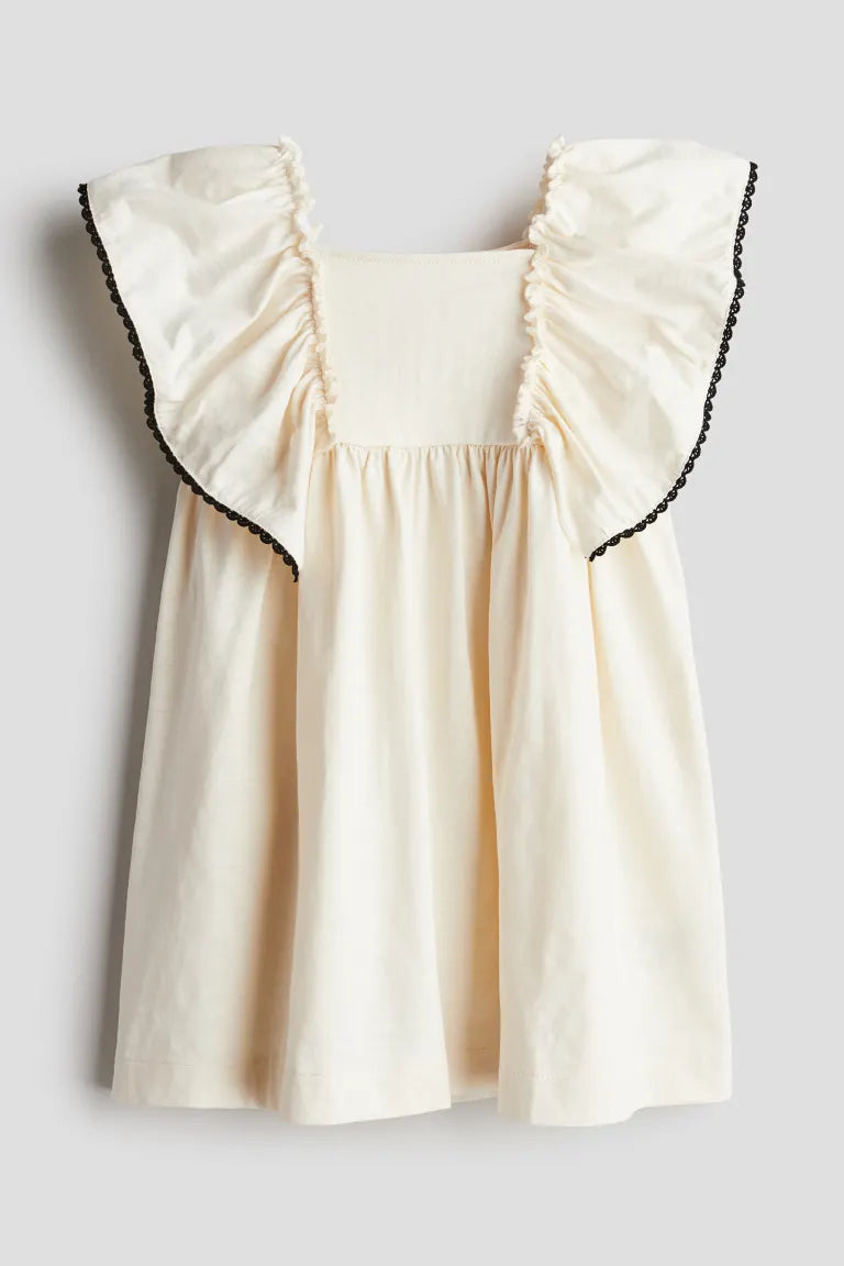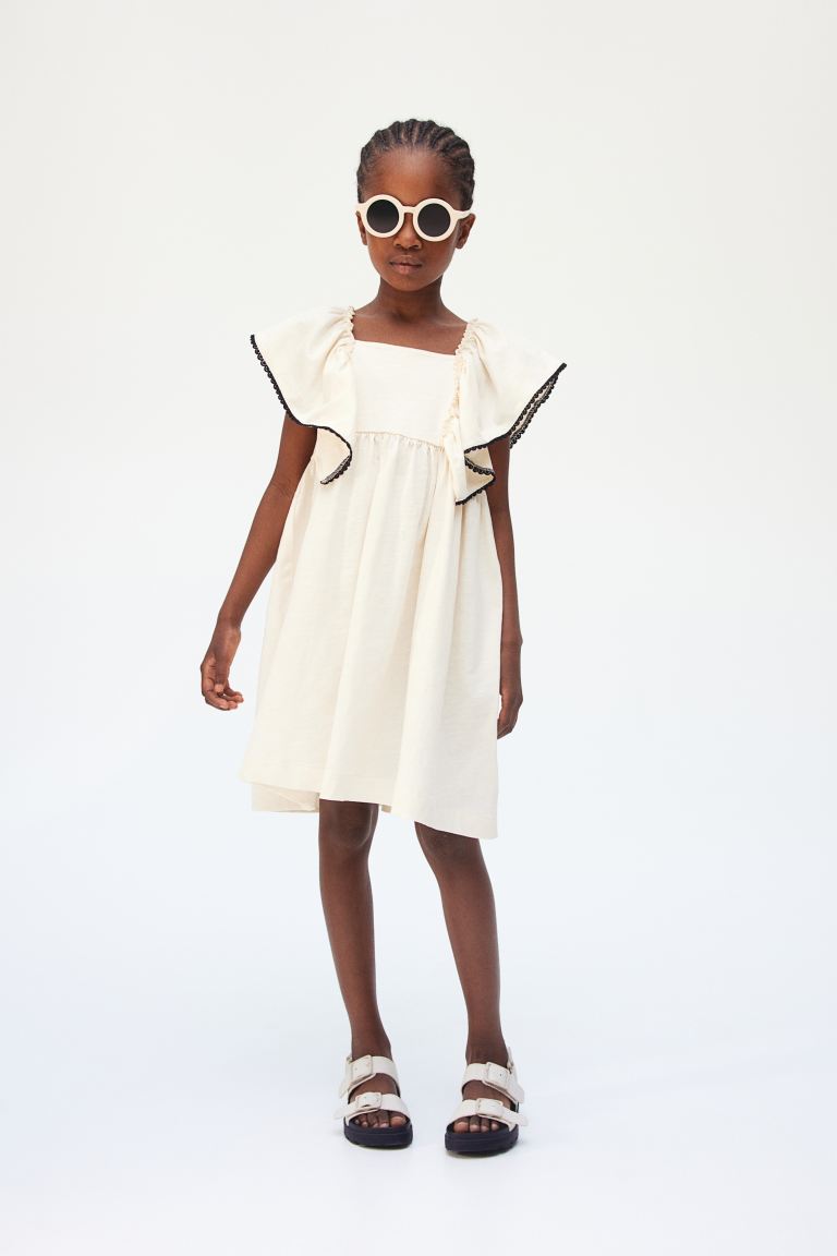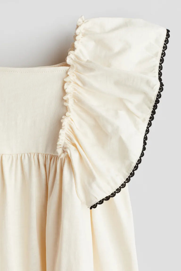 Dress in soft cotton jersey. Square neckline, narrow elastic at shoulders, and picot-trimmed butterfly sleeves. Gathered seam above midsection.