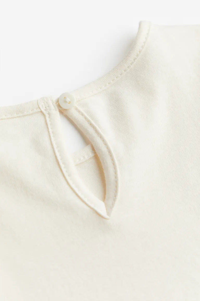 Overall shorts in airy, woven cotton fabric. Ruffle-trimmed straps with buttons at front, bib with ruffle-trimmed sides, and elastic at back of waistband. Snap fasteners at gusset and ruffle-trimmed hems with narrow elastic.