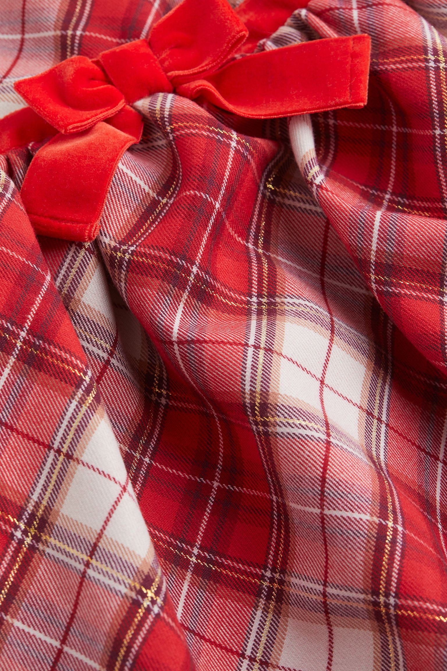 Sleeveless dress in soft twill with a lightly brushed finish and glittery threads. Concealed zipper at back, seam at waist with attached velvet ribbon and decorative bow, and flared skirt. Lined.