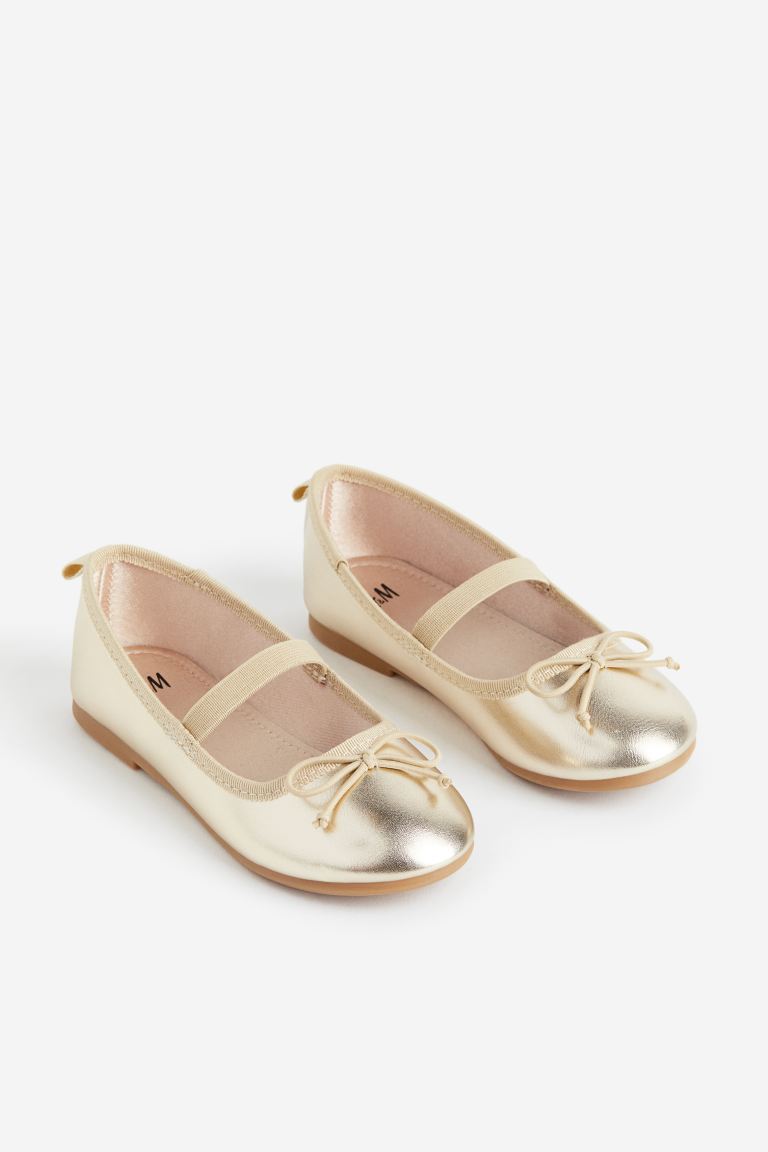 Ballet flats in shimmery metallic faux leather. Satin lining, satin insoles, and finely fluted soles. Sole thickness approx. 1/8 in.