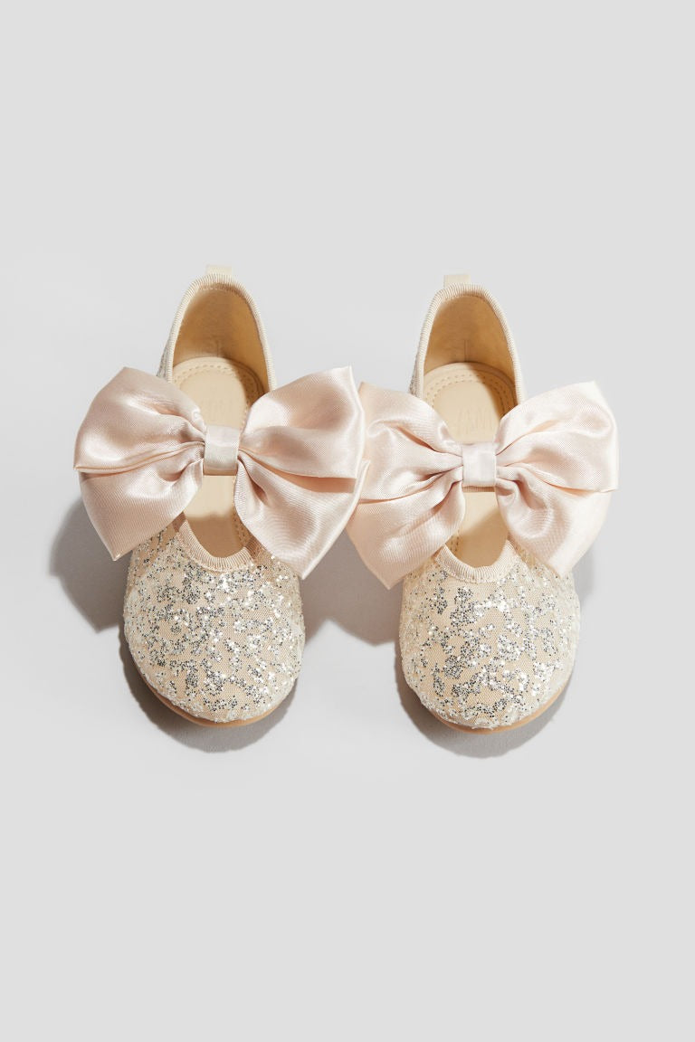 Glittery, low-heeled shoes with rounded toes and adjustable foot strap. Lining and insoles in recycled polyester. Heel height 1 in.
