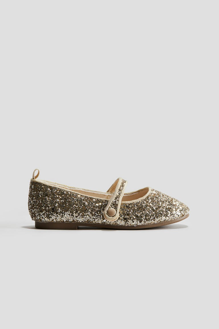 Glittery, low-heeled shoes with rounded toes and adjustable foot strap. Lining and insoles in recycled polyester. Heel height 1 in.